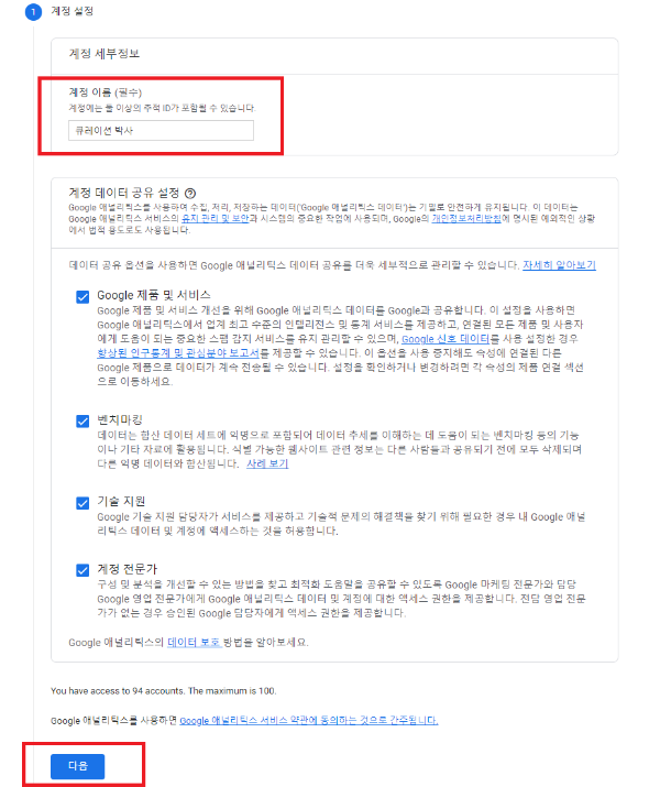 그러면 계정, 속성 등을 만들 수 있는 페이지가 존재합니다. 사이트를 등록 시킨적이 없으니 계정 만들기를 누릅니다.