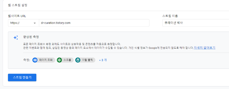 웹 스트림 설정이라는 것이 나오는데 다시 한번 블로그 주소와 해당 스트림 이름을 만듭니다. 스트림 이름은 그냥 블로그 이름을 적어주면 됩니다.