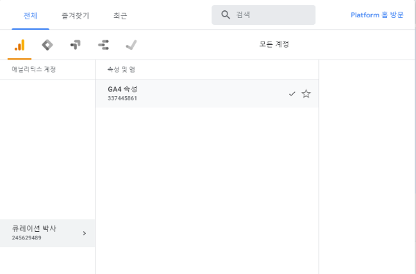 적용이 완료되었다면, 구글 애널리틱스로 돌아가서 위와 같이 신규로 만든 애널리틱스 계정을 선택합니다.