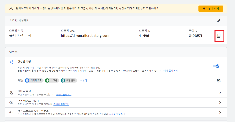 스트림이 만들어졌으면, 위 상단 이미지 네모 박스에 있는 측정 ID 복사 버튼을 클릭합니다.