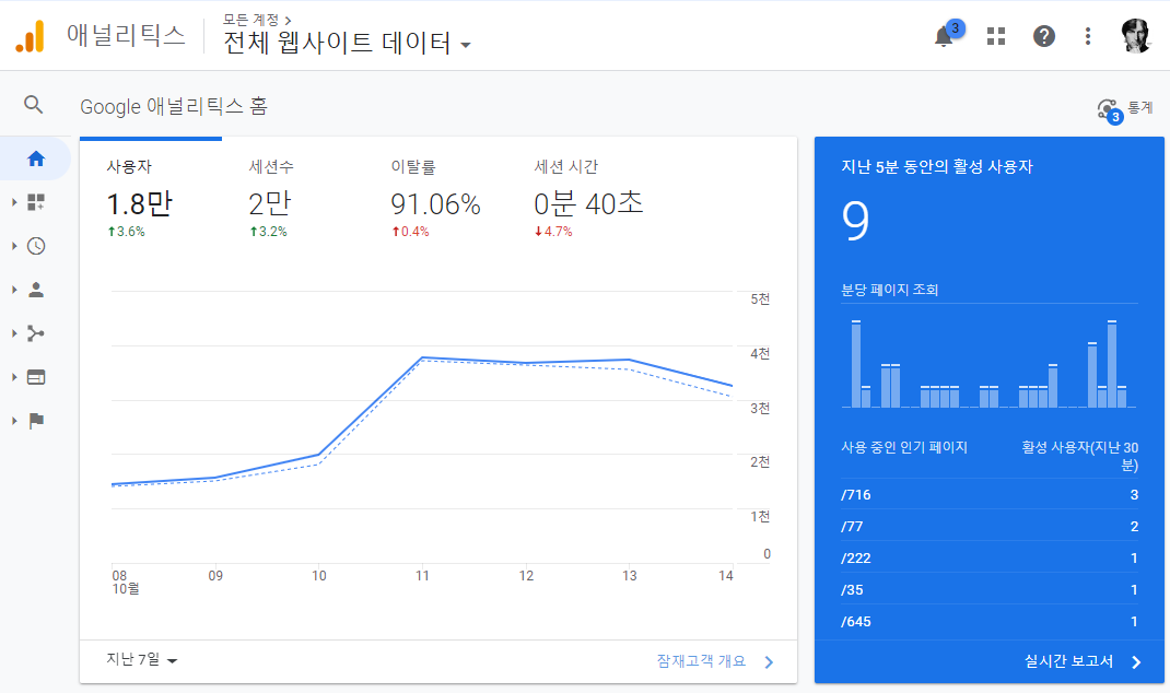 구글은 블로그 혹은 사이트에 사용자 유입을 극대화 시켜주기 위해 다양한 도구를 제공해주고 있습니다. 그 중 애널리틱스라는 것을 활용하면 어떤 식으로 내 웹사이트에 접근을 하면 어떤 기기로 들어오는지 재방문율은 어떤지 등을 모두 파악할 수 있고 실시간으로 어떤 페이지를 보는지도 알 수 있습니다.