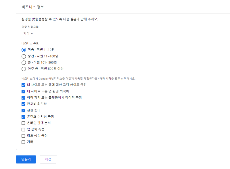 비즈니스 정보는 중요한 설정은 아닙니다. 설문조사에 가까운데요. 그래도 애널리틱스를 사용하고 있으니 질문에 맞게 답을 작성하고 만들기를 선택합니다.