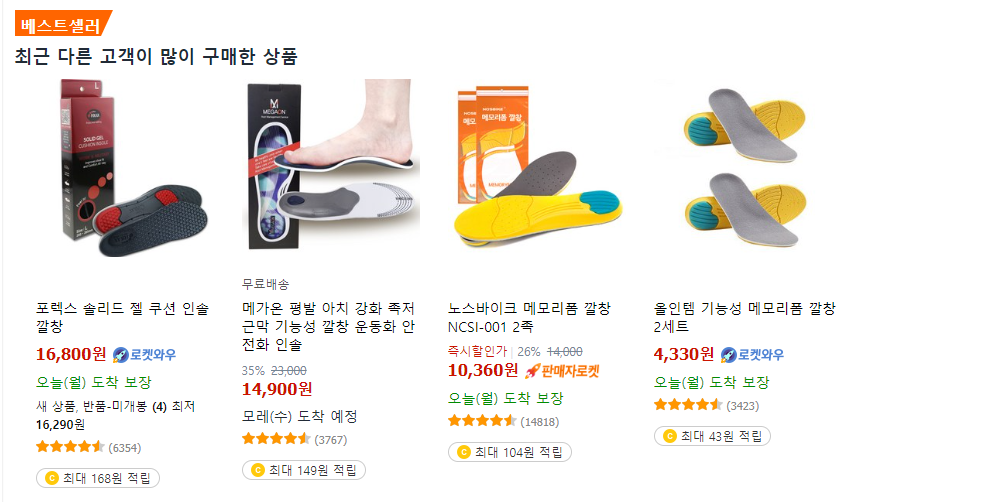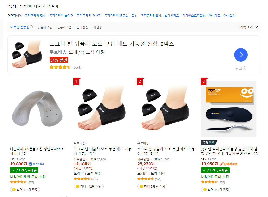 족저근막염으로 쿠팡 등에서 제품을 검색하니 일반적으로 족저근막염 깔창이 많이 나오고 있습니다만, 깔창의 경우 신발마다 사야 되는 문제가 있어서 비용적인 문제가 있고, 딱딱한 샌들 등에는 깔창을 낄수가 없어서 다른 제품을 찾다보니 쿠션 패드를 찾을 수 있었습니다.