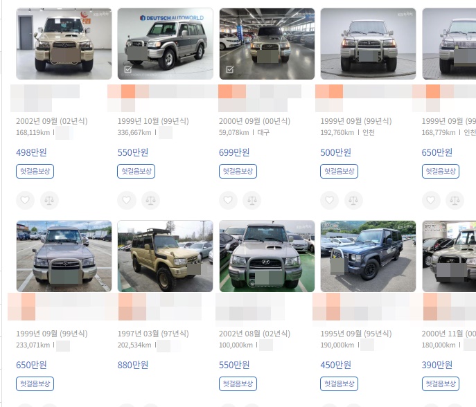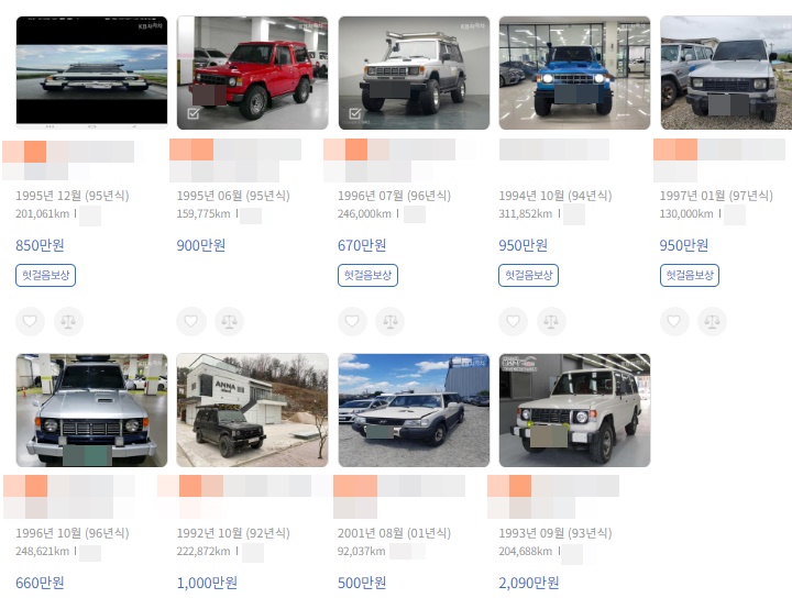 갤로퍼2의 경우 숏바디(2도어)의 경우 킬로수가 적어도 가격이 오히려 더 쌌으며, 대부분 갤로퍼2의 경우 7인승을 선호하는 것을 볼 수 있는 것 같습니다. 아직은 탈만하다고 할 수 있는 12만km 정도도 450만원 정도면 살 수 있는 것 같습니다.