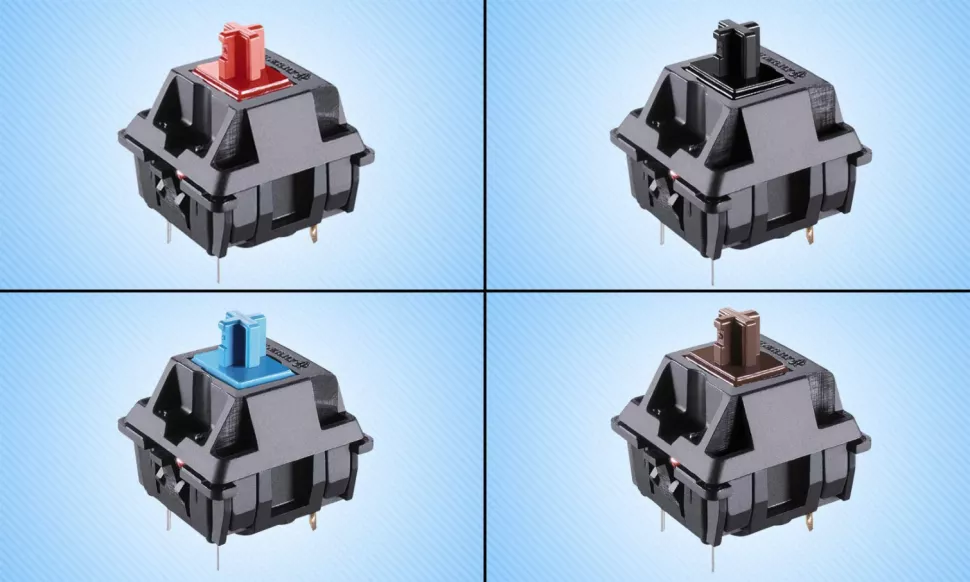 그러다보니 기계식 키보드의 대다수는 체리사의 규격과 동일하게 만들어졌으며, 서로간에 커스터마이징이 가능한 수준입니다. 그래서 기계식 키보드라는 정의를 정확하게 내리지 못하지만, 축의 경우 체리사에서 만든 스위치를 기계식 키보드의 스위치로 설명이 가능할 정도입니다. 위 이미지를 기준으로 왼쪽 상단부터 시계 방향으로 적축, 흑축, 갈축, 청축으로 로지텍이나 레이저에서 만든 독자적인 스위치도 있지만 그런 스위치가 있는 제품을 사진 말고 일단 체리스위치 형태의 기계식 키보드만 사시는 것이 좋습니다.